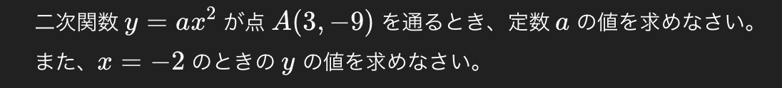 (3,-9)を二次関数の式に代入するとa=-1となる。よってy=-xの二乗。